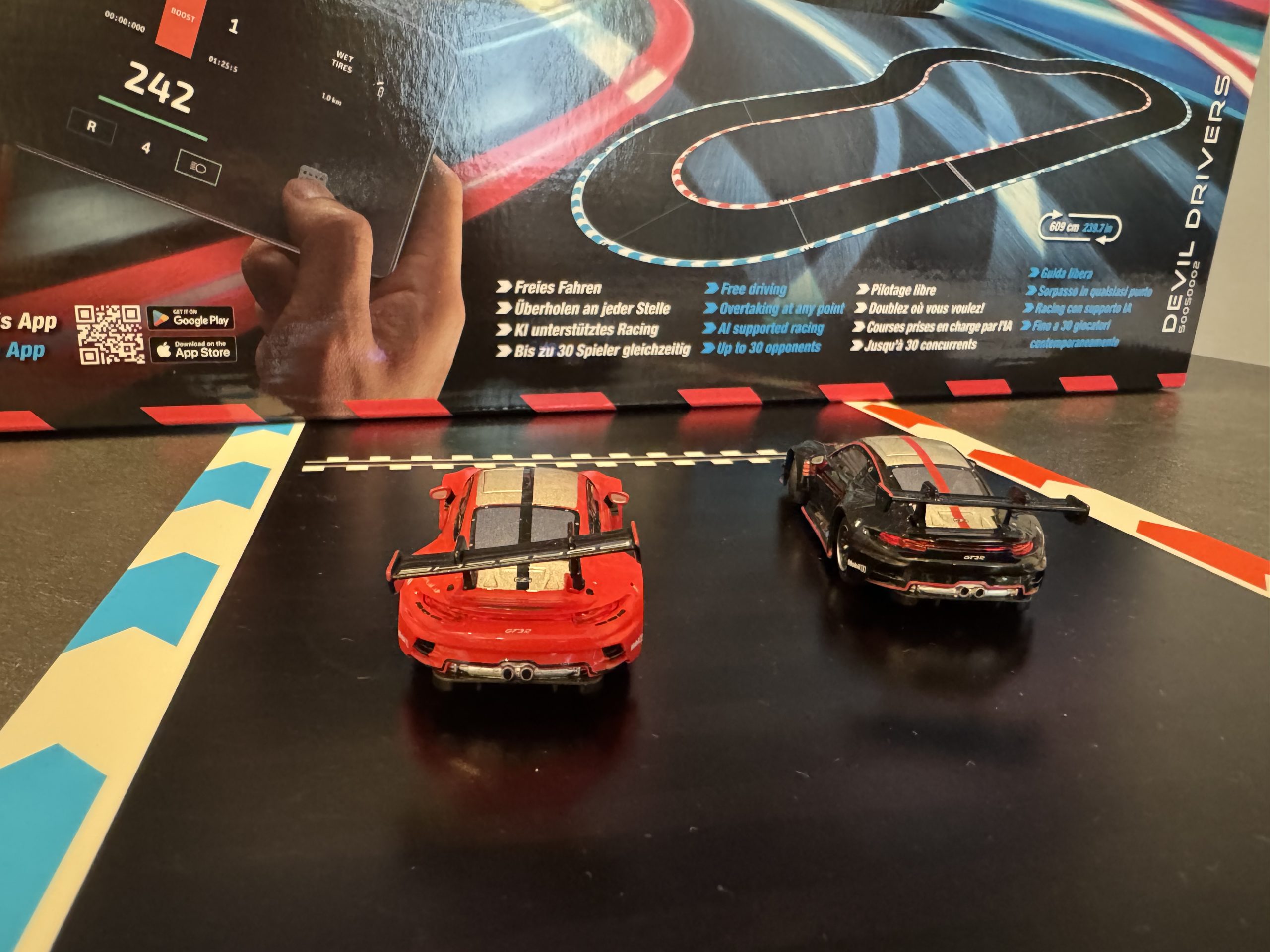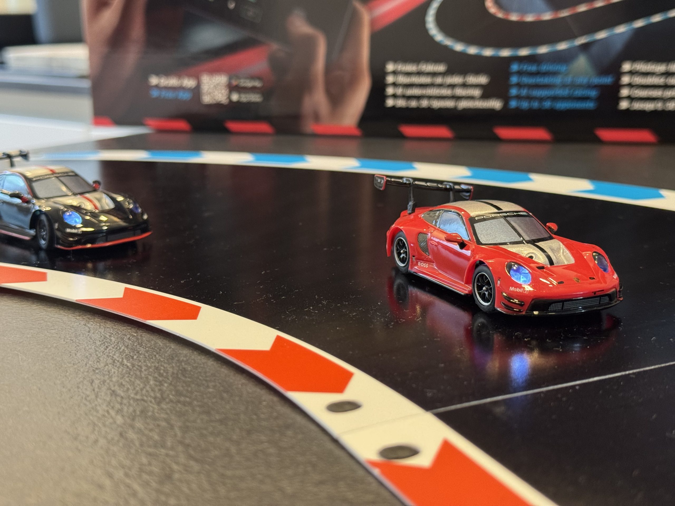 Gesteuert wird das Ganze bequem per kostenloser App. Die Verbindung klappt problemlos und eröffnet neue Möglichkeiten: automatische Streckenerkennung, individuelle Fahrzeugeinstellungen sowie originalgetreue Lichtfunktionen vorne und hinten sind mit an Bord. Auch das Motorengeräusch wurde nicht dem Zufall überlassen, hier dröhnt es authentisch aus den kleinen Flitzern oder Lautsprechern des Smartphones.